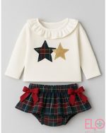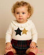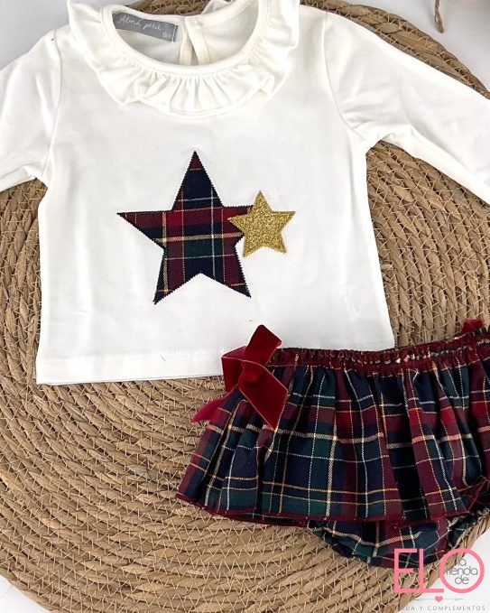 La camiseta es blanca, de manga larga con bordado de estrellas y volantes en el cuello.