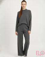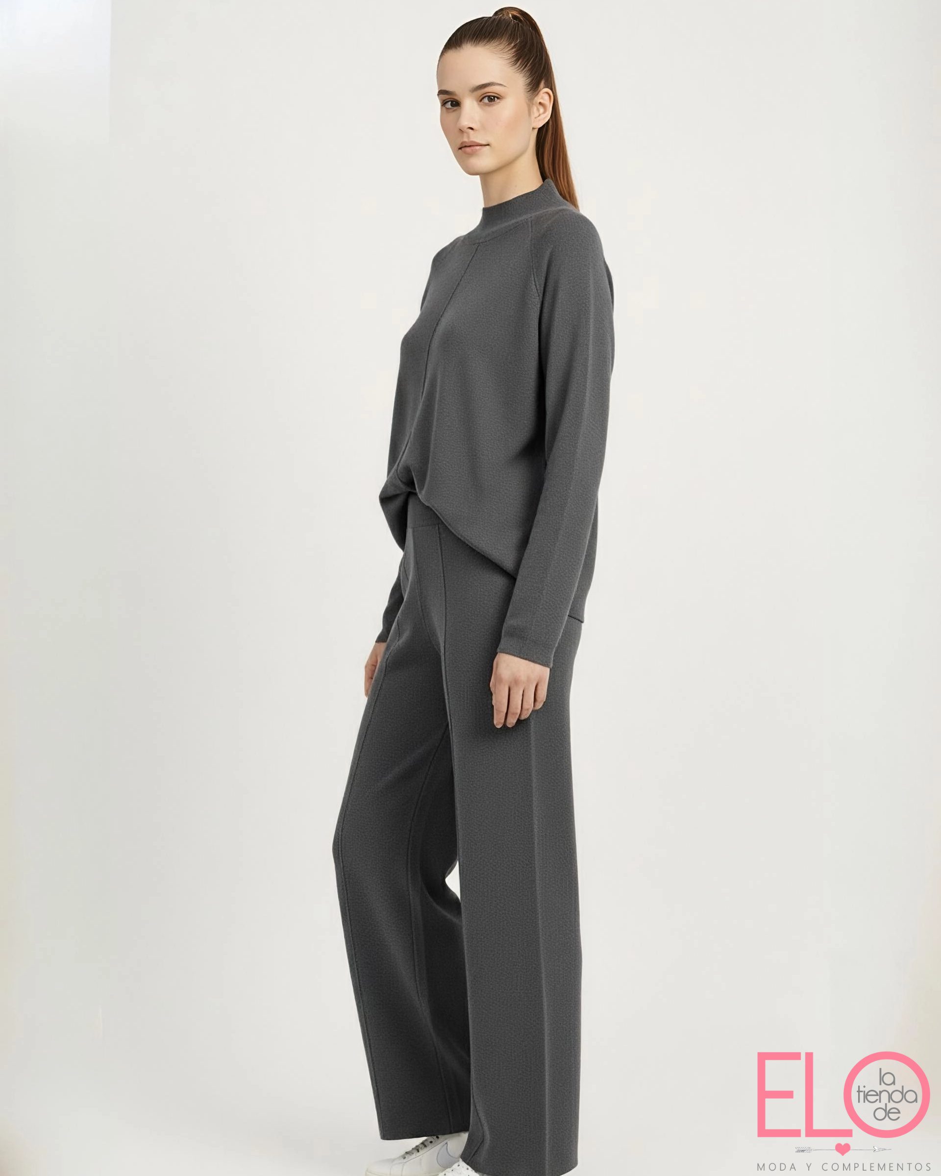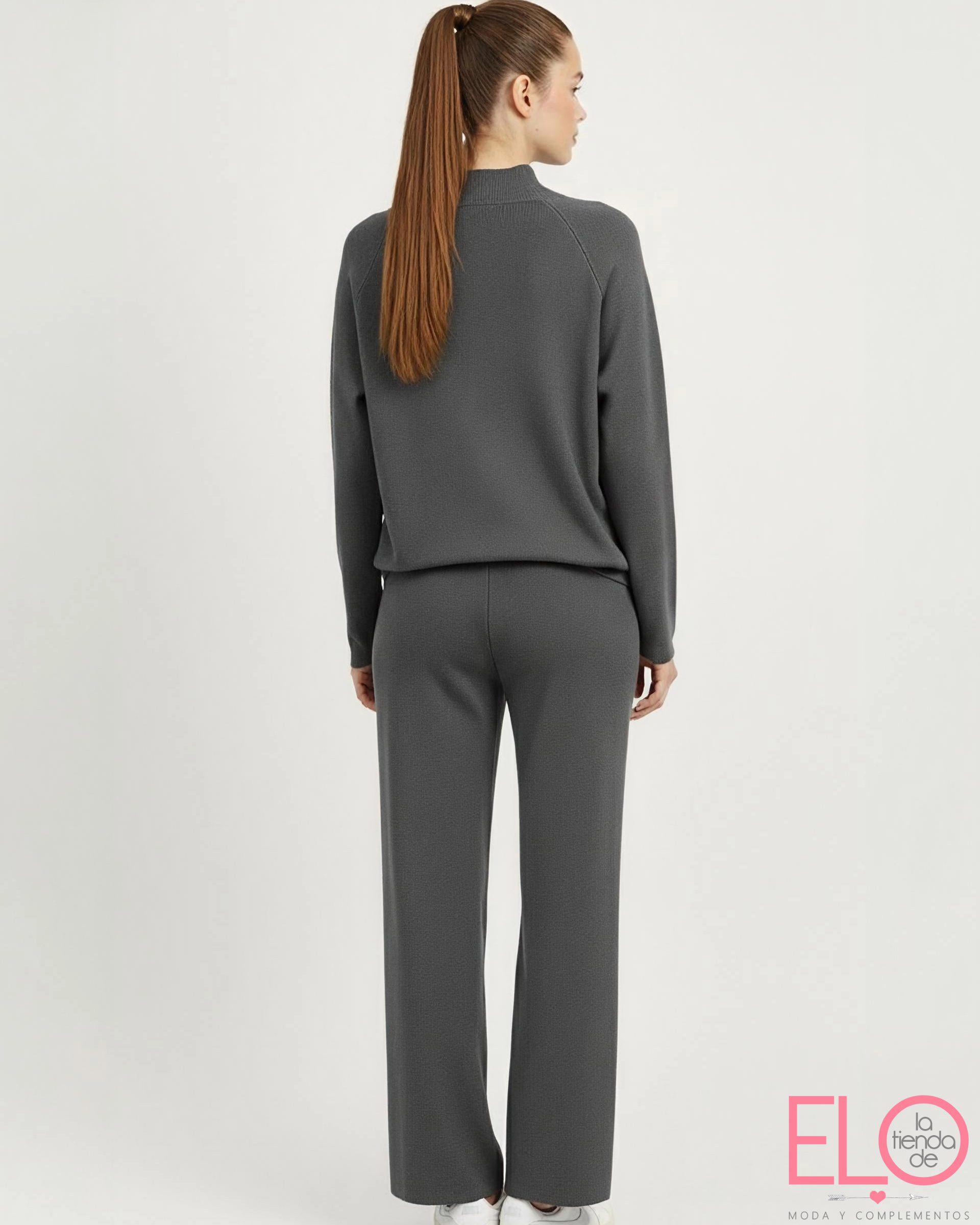 Conjunto de punto de color gris, es liso pero lleva en el centro de la parte de arriba un detalle formando una línea con el mismo punto. El pantalón también tiene la línea en el centro de la pierna. La cinturilla del pantalón es elástica.