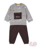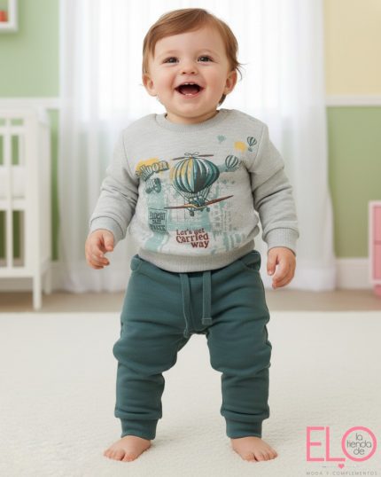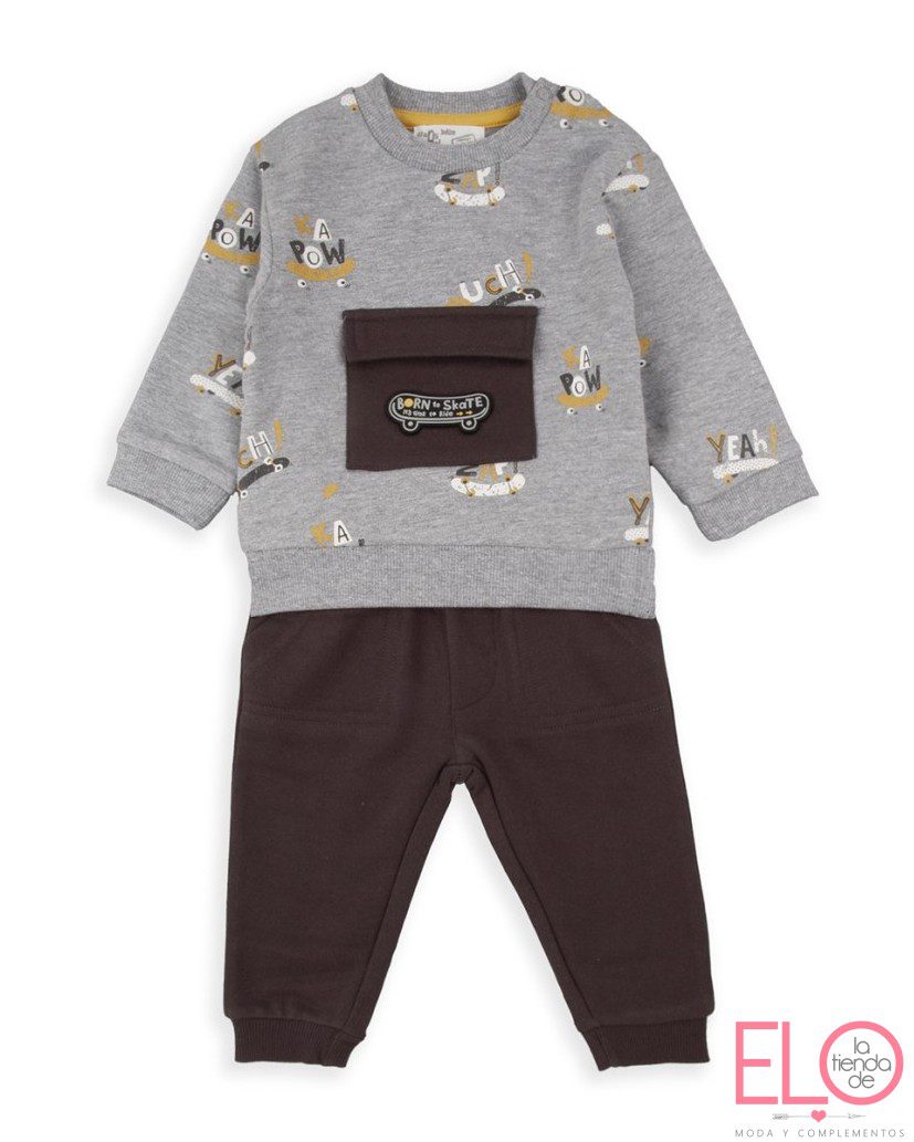 Conjunto de sudadera gris y pantalón de color gris oscuro.
