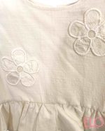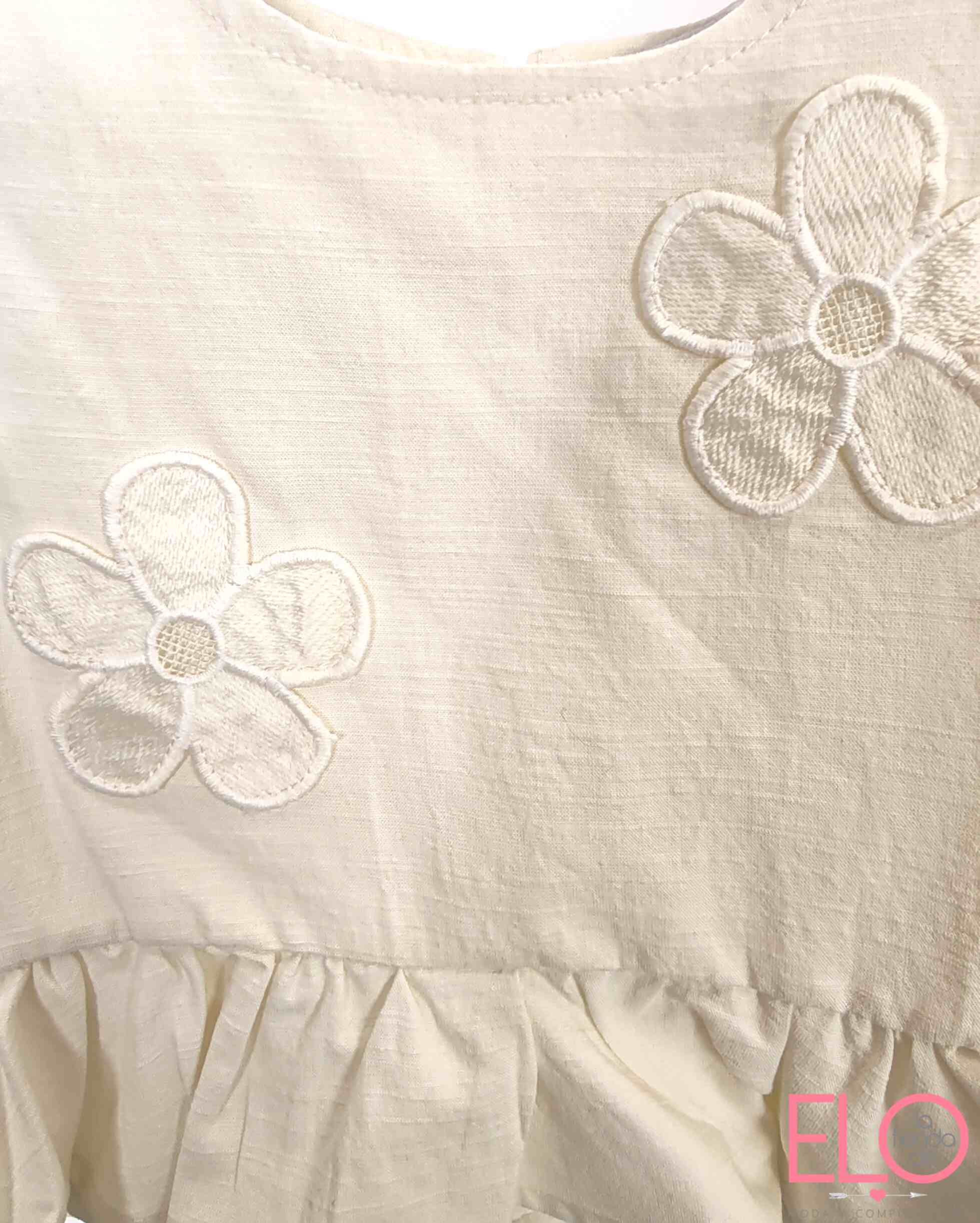 Camiseta sin mangas con volante en el bajo y delicadas flores en relieve aplicadas en el frontal, que aportan un toque dulce y especial.