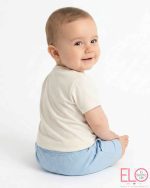 Conjunto de camiseta blanca y pantalón corto celeste.
