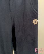 El pantalón con goma en la cintura y una flor rosa al lado.