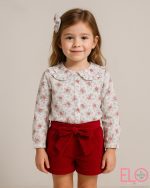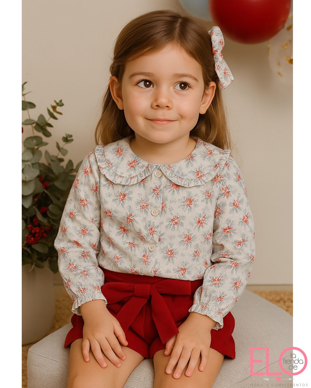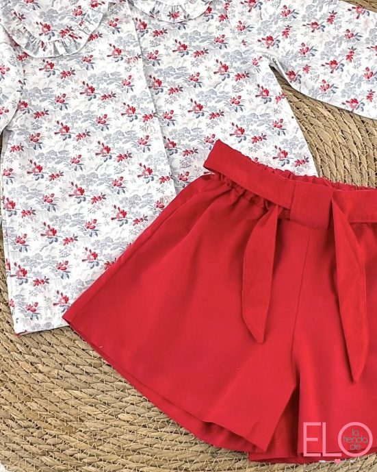 Conjunto de camisa de color blanco con estampado de flores rojas y azul.