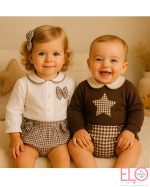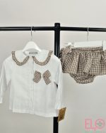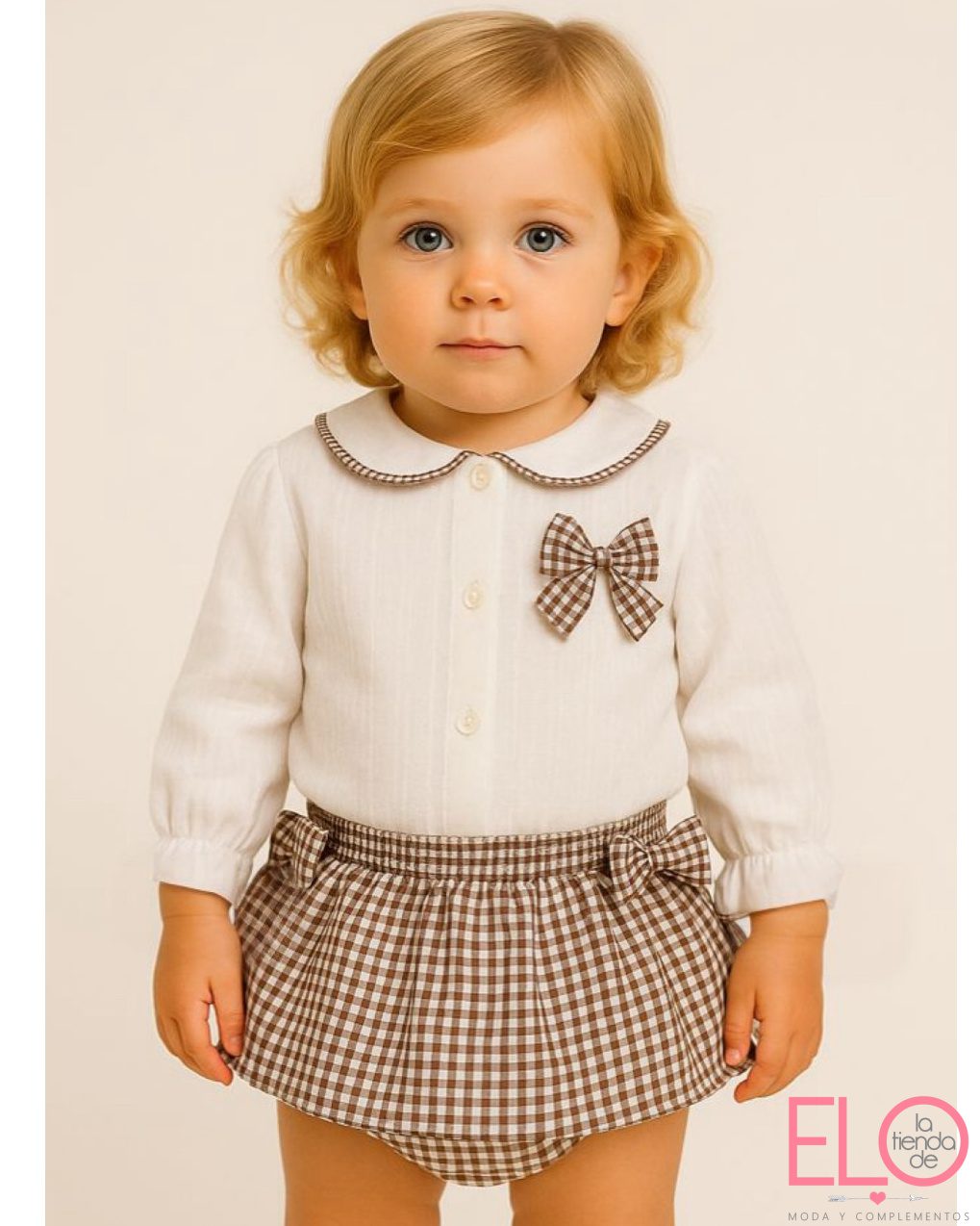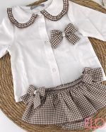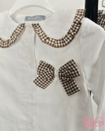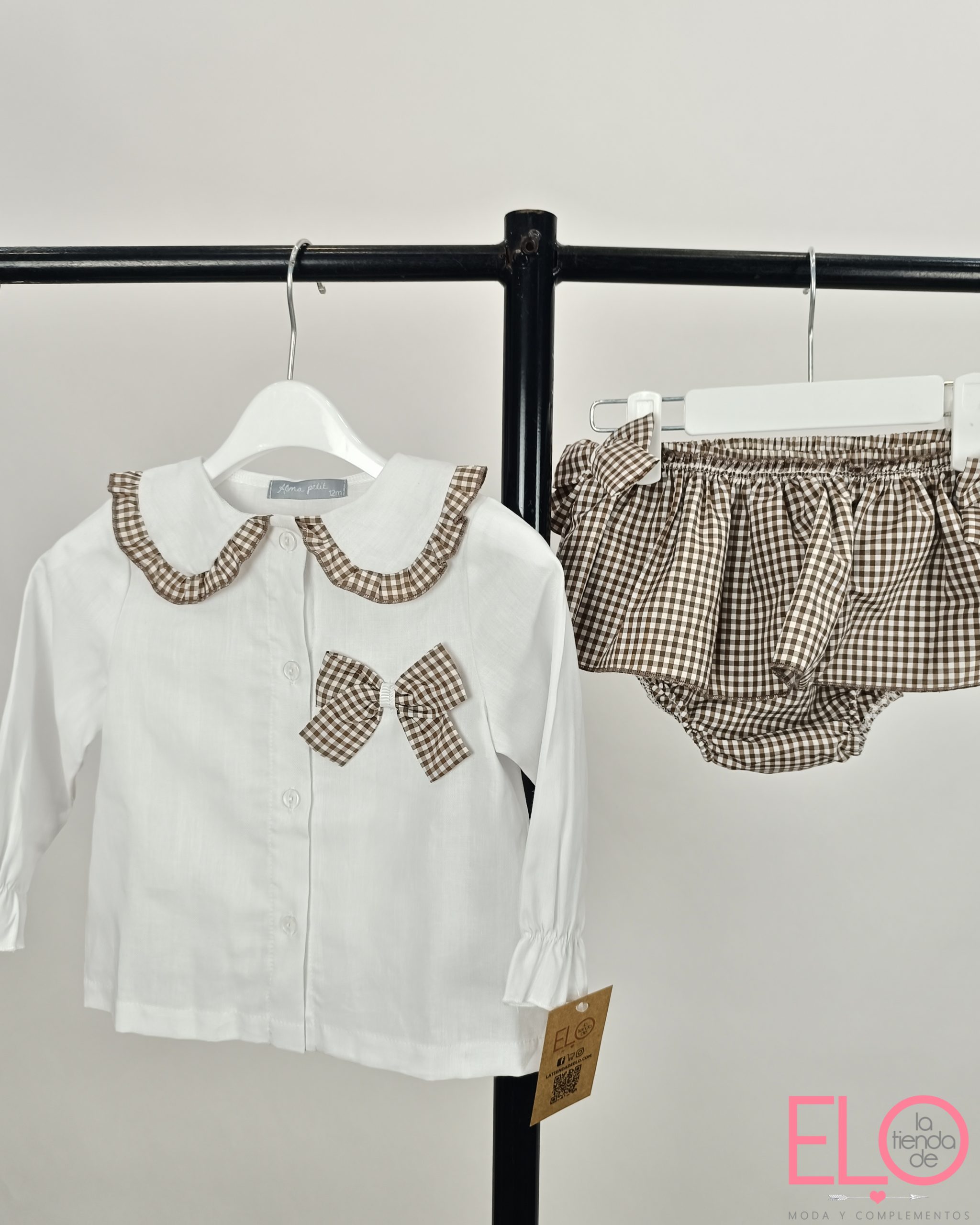 La camisa es blanca con cuello decorado con tela a cuadros de color marrón y blanco. Lleva un listón del mismo estampado.