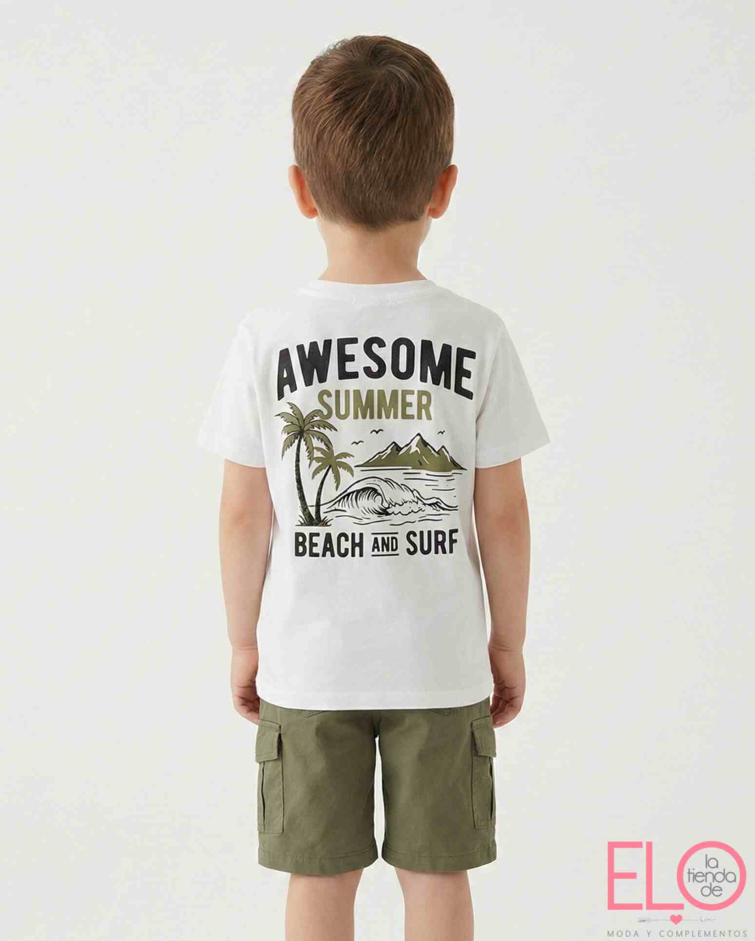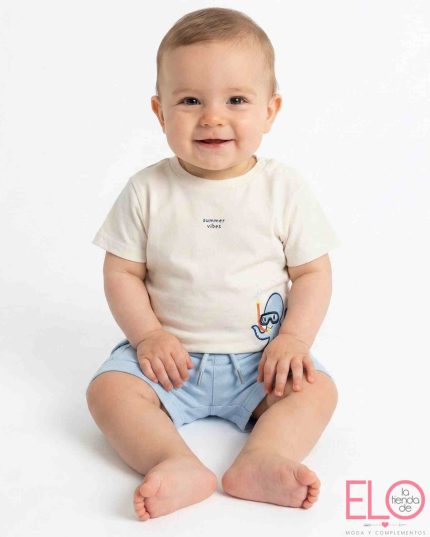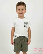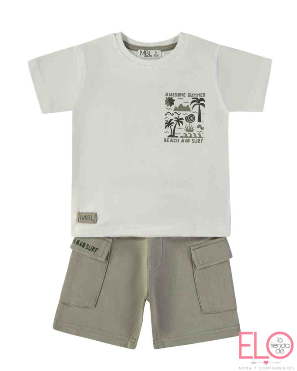 Conjunto de camiseta yu bermuda en color blanco y caqui.