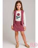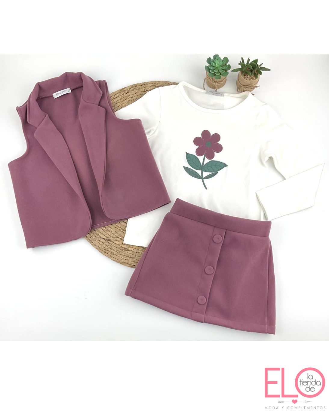 La falda lleva botones decorativos frontales y cintura cómoda, mientras que el chaleco, sin mangas y con solapa, completa el conjunto con un aire moderno y elegante.