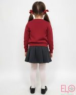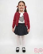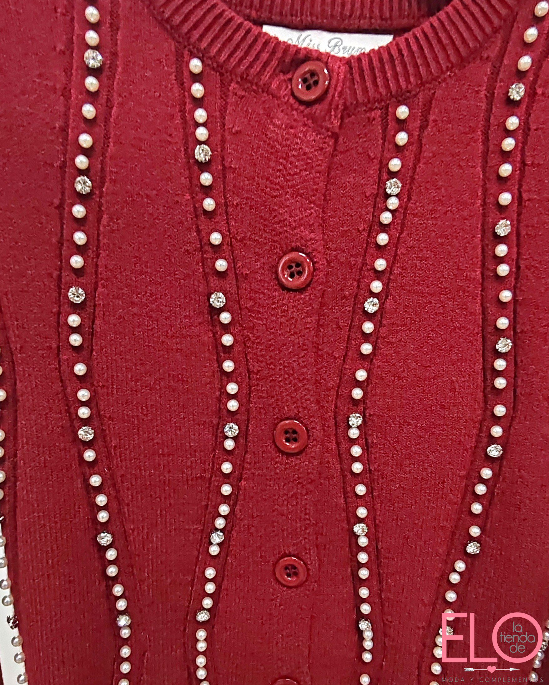 El cardigan de color granate con aplicación de brillos y perlas en el tejido.