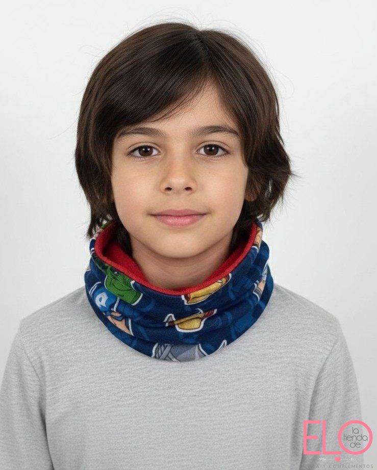Cuello de niño de estampado de avengers con forrito polar en color azul por la parte de dentro.