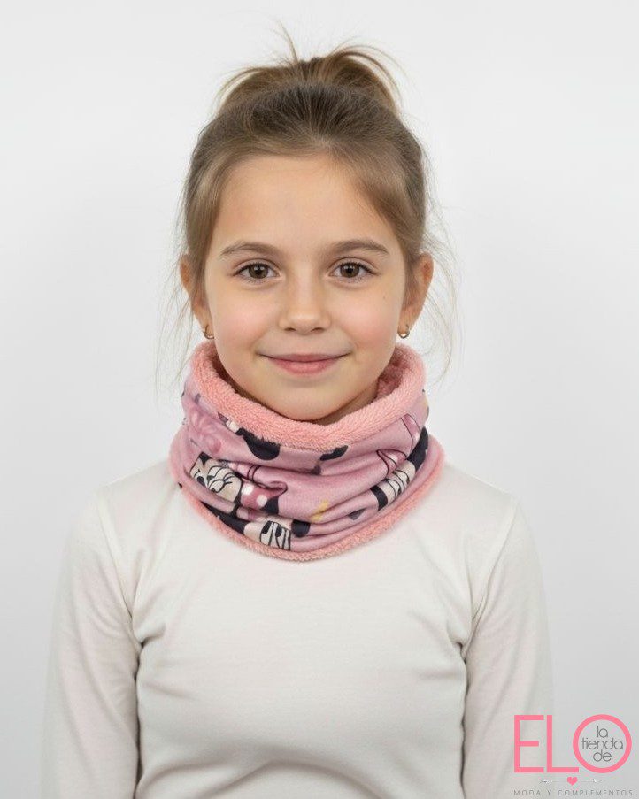 Cuello infantil de estampado de Minnie con forrito polar en color rosa por la parte de dentro.