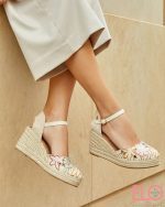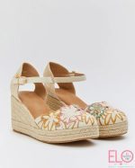 Cuñas es esparto de color beige con bordado de flores de colores.