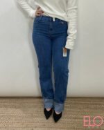 De corte recto y pata ancha, la pata mide 22 cm y lleva dobles.