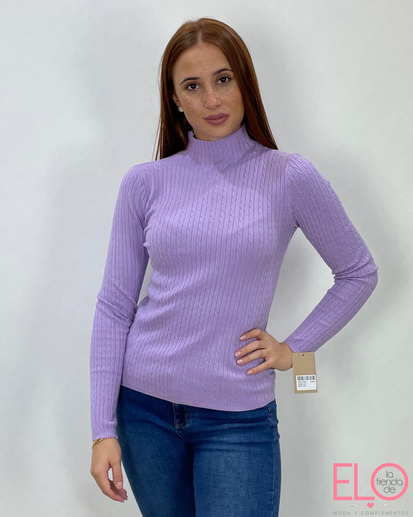 Jersey de punto con cuello chimenea, lleva un trenzado en el tejido que lo hace mas mono.