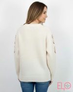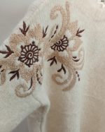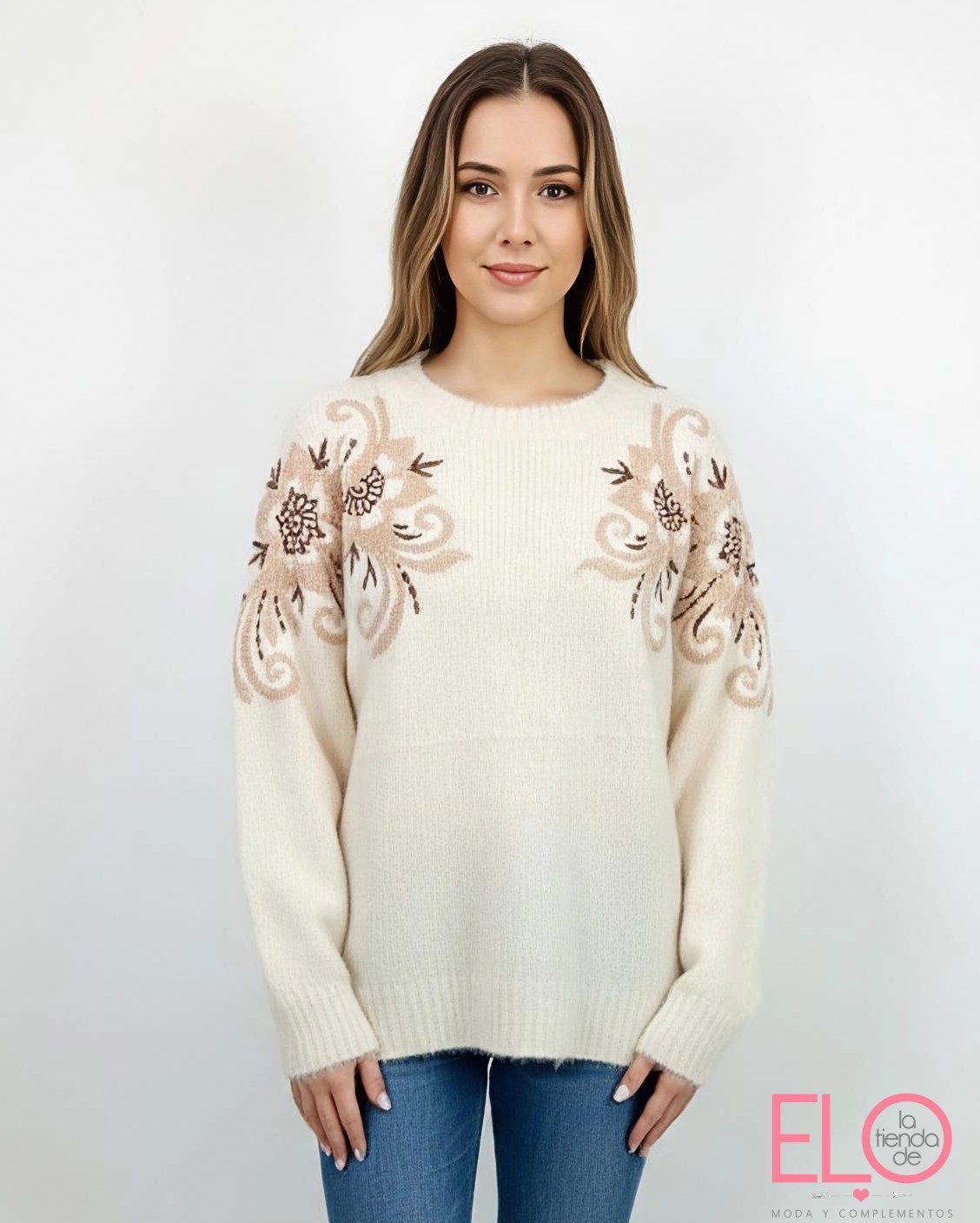 Jersey de tejido tipo lana, con bordados de flores en el pecho y hombros.