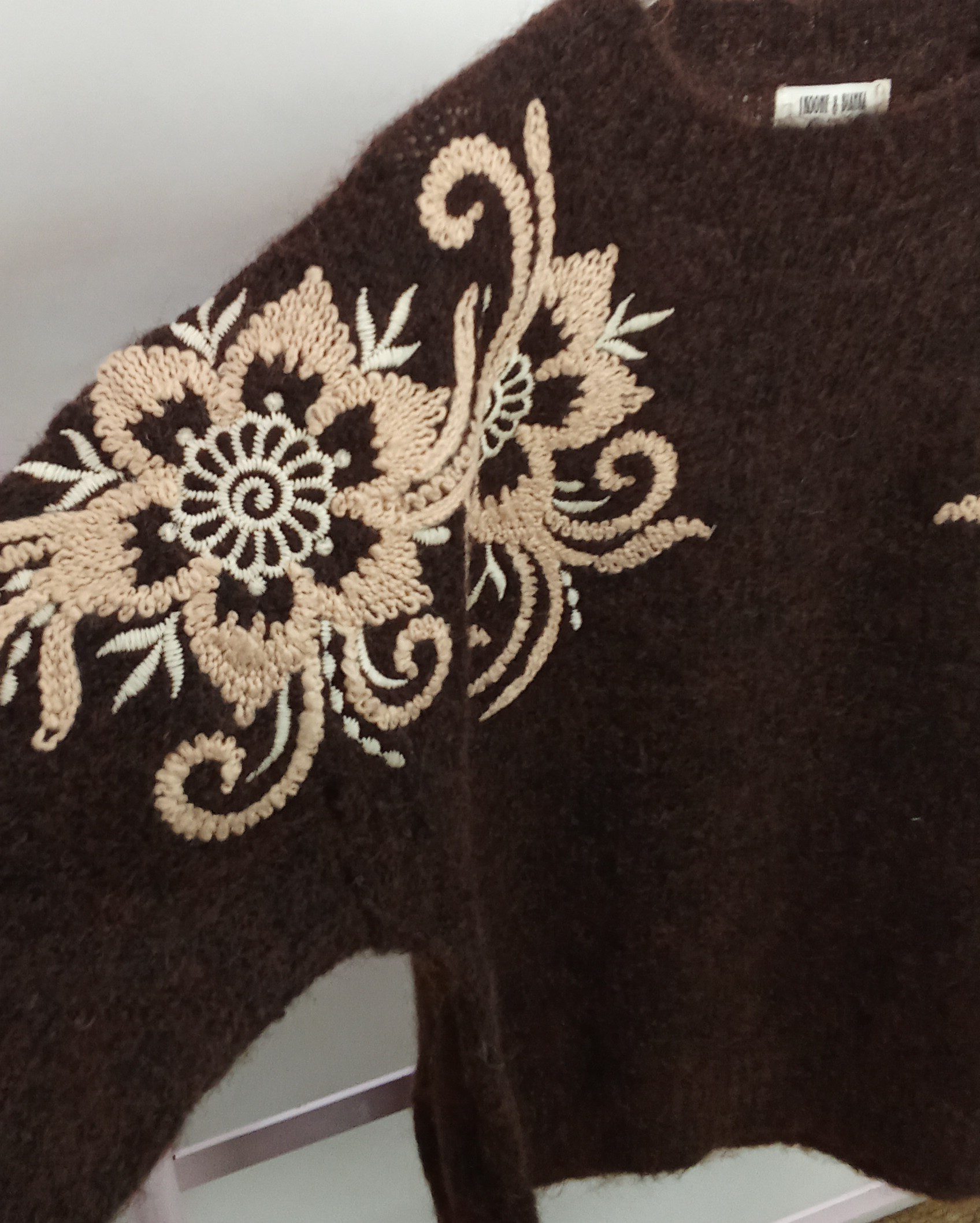 Jersey de tejido tipo lana, con bordados de flores en el pecho y hombros.