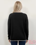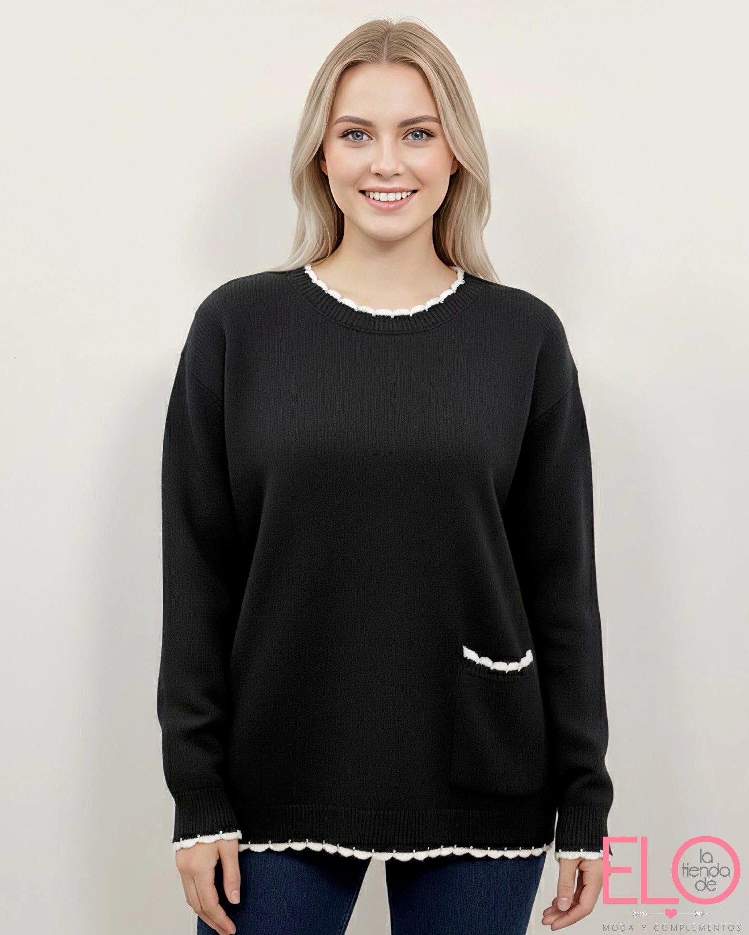 Jersey de tacto super suave y agradable, el borde de las mangas , bajo y cuello forma unas ondas en blanco y incorpora un bolsillo igual.