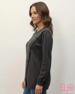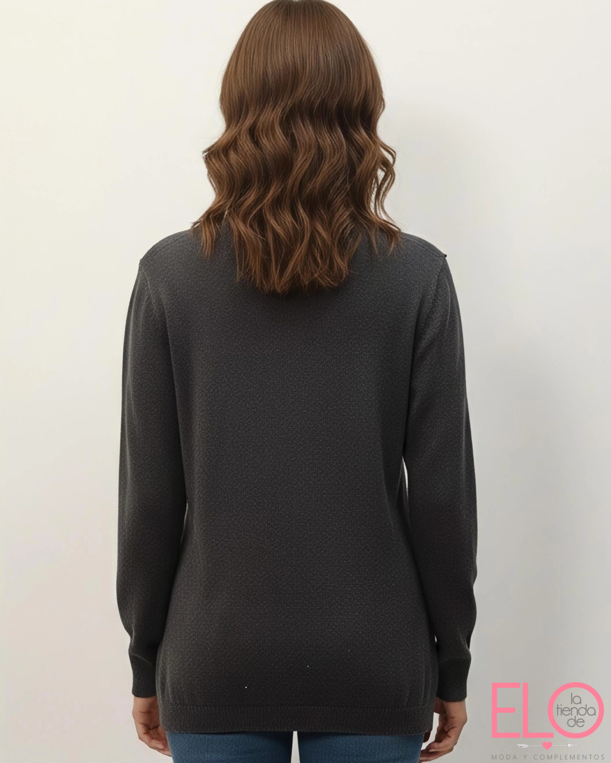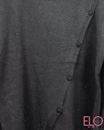 Jersey en color gris con detalle de piedrecitas de strass y falsos botones en el lateral formando una diagonal. Por la parte trasera es liso