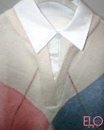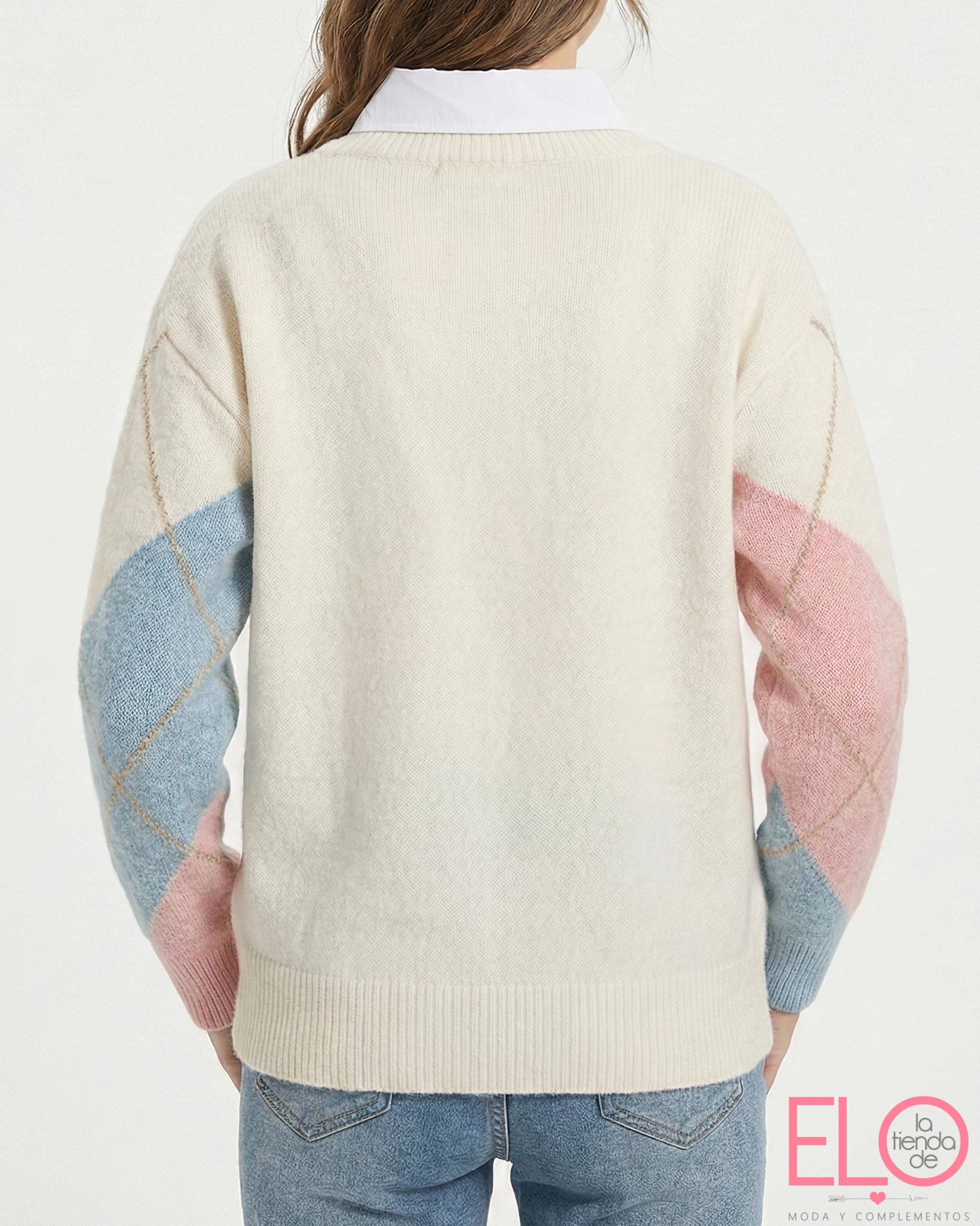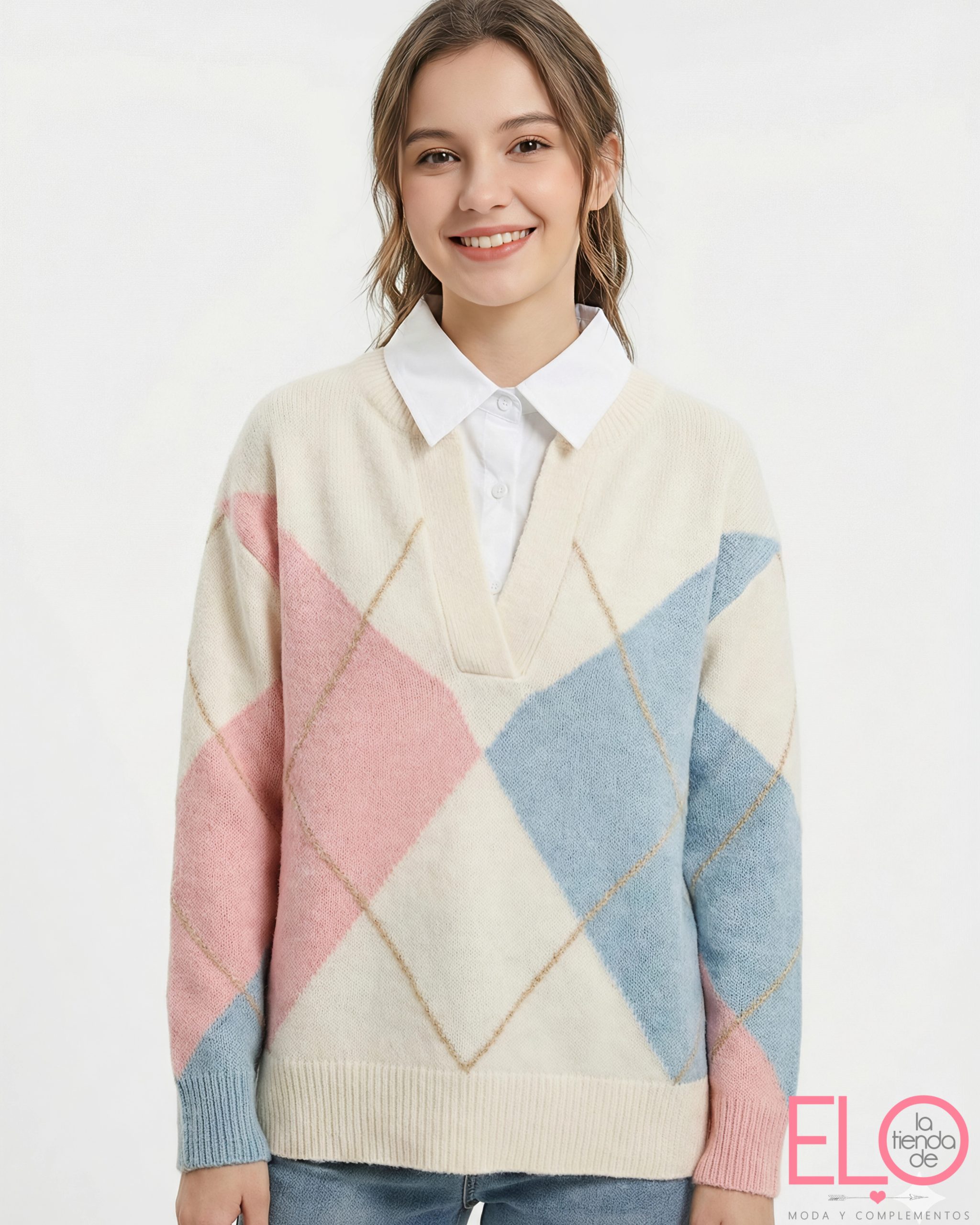 Jersey punto rombos, cuello pico con cuello de camisa.