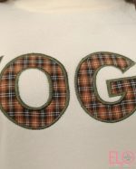 Con letras bordadas con diseño de cuadros.