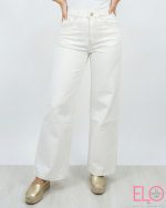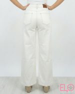 Pantalón denim bastante elástico de pata ancha en color blanco roto.