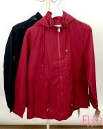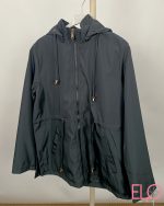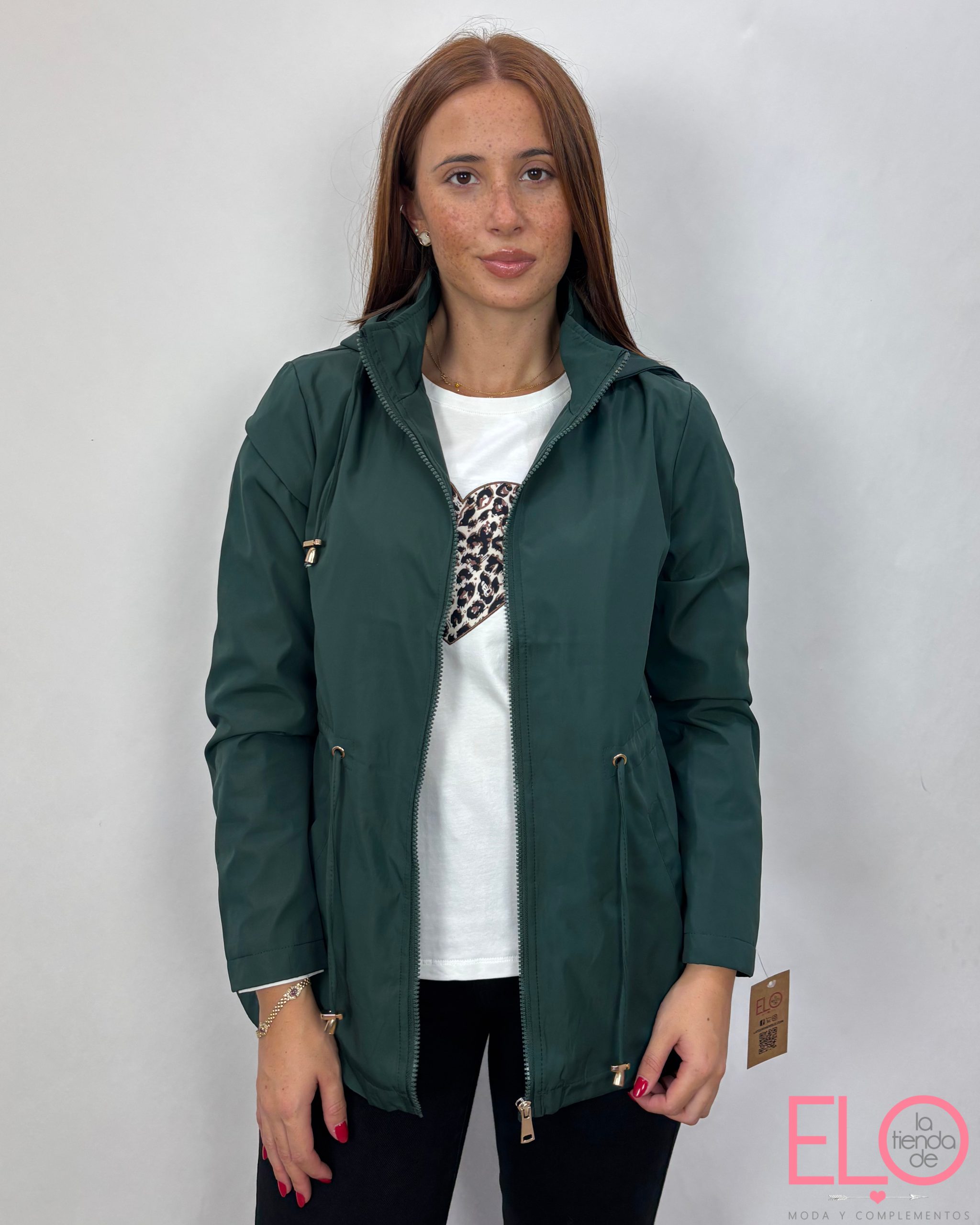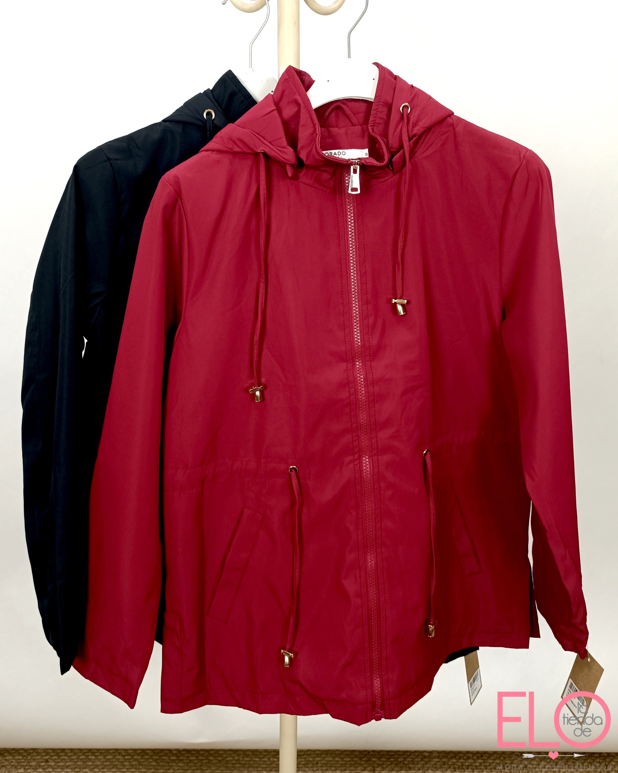 Lleva cordón en la cintura para ajustar y capucha que se puede quitar.