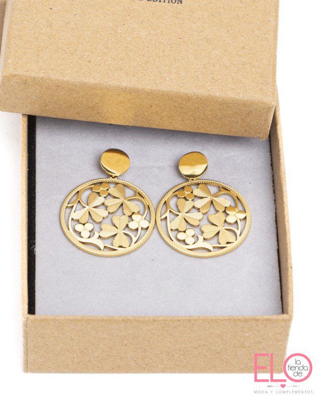 Pendiente con dije calado con motivos de tréboles. en acero inoxidable con baño de oro en 14K de 4 micras.