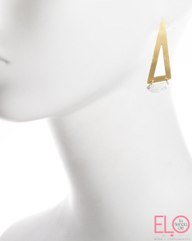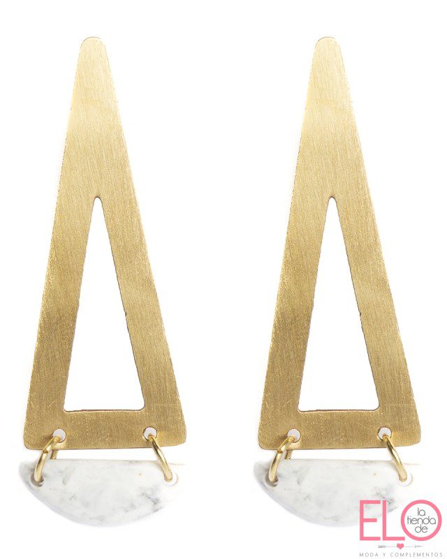 Pendiente largo de pieza triangular calada metálica con pieza semicircular de resina efecto mármol.