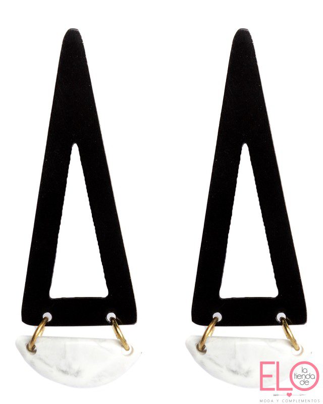 Pendiente largo de pieza triangular calada metálica con pieza semicircular de resina efecto mármol.