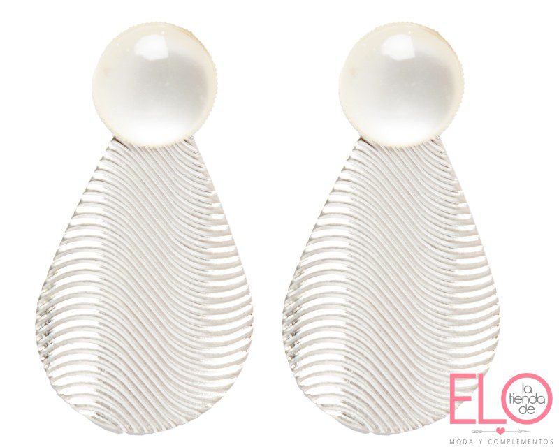 Pendiente de metal estilo retro. acabado satinado. con top de resina y colgante en forma de gota con trabajo de textura y relieve en color plateado. Composición: metal.