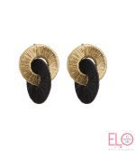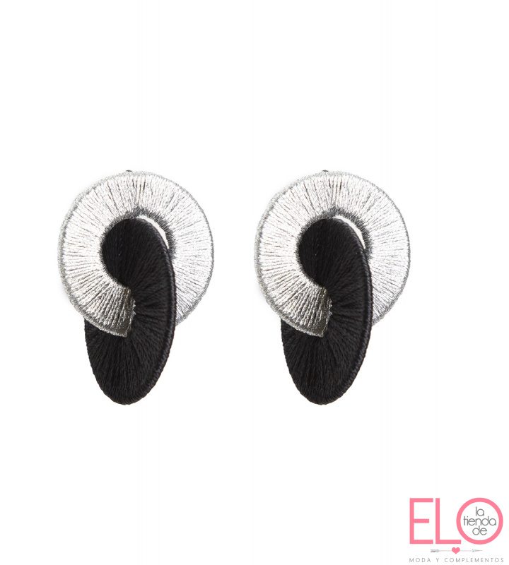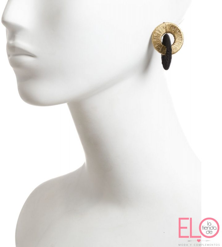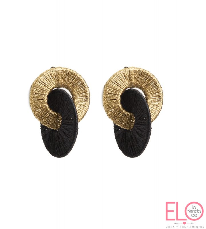 Pendiente en dos aros entrelazados, en dos colores: negro con dorado antiguo, negro con plata antigua.