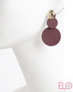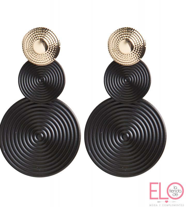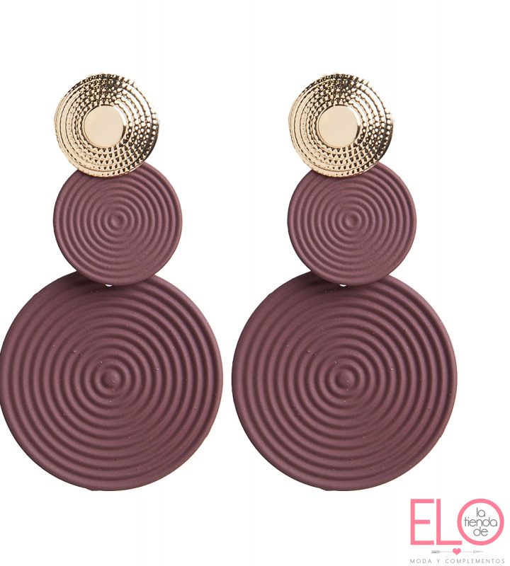 Pendiente articulado en tres piezas redondas de metal con textura de espiral, en dos colores: negro/dorado, burdeos/dorado.