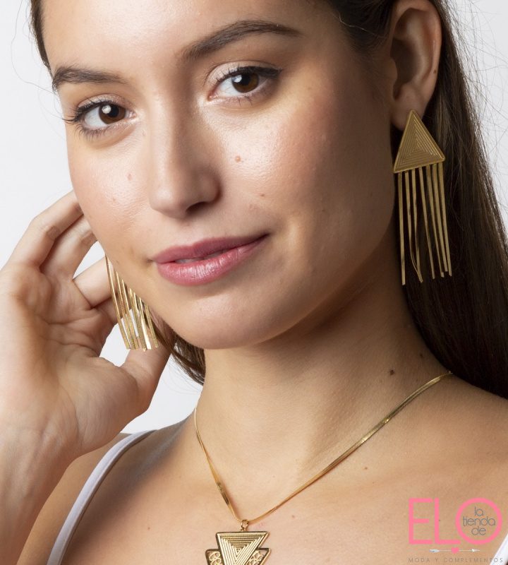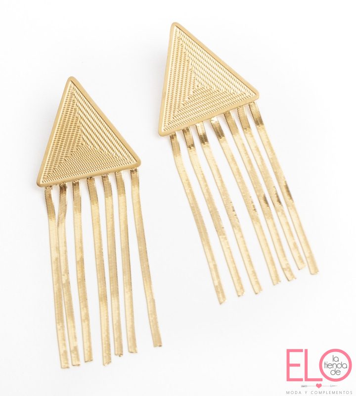 Pendiente en forma de triángulo con trabajo de textura y lluvia de cadenas tipo «snake», en acero inoxidable con baño de oro de 14K.