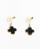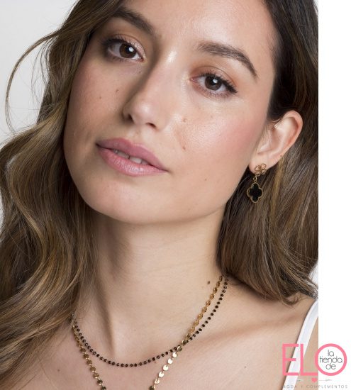 Pendiente en dos piezas en flor una calada y otra con piedra negra. de acero inoxidable con baño de oro de 14 kilates.