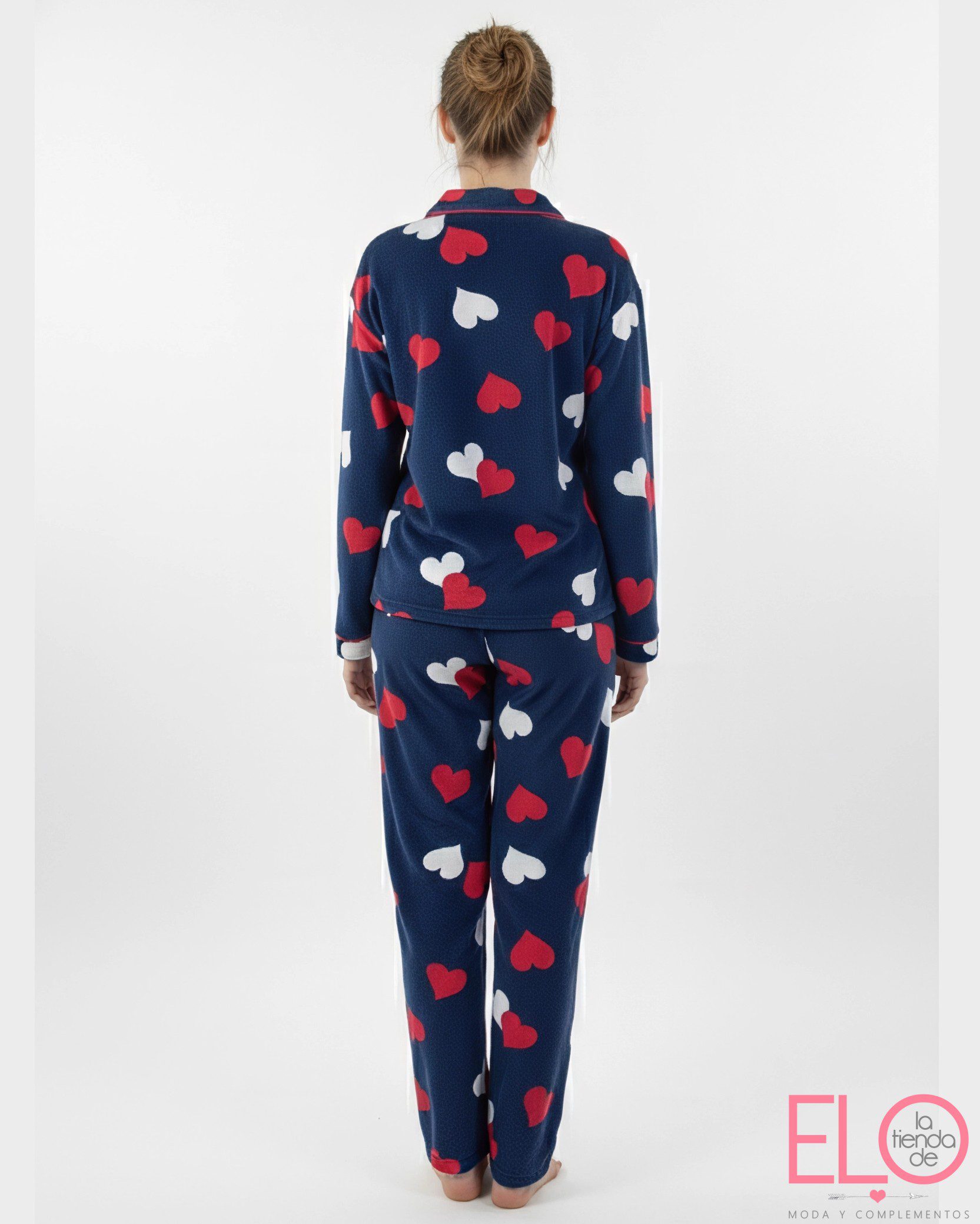 De color marino con estampado de corazones de color blanco y rojo.