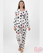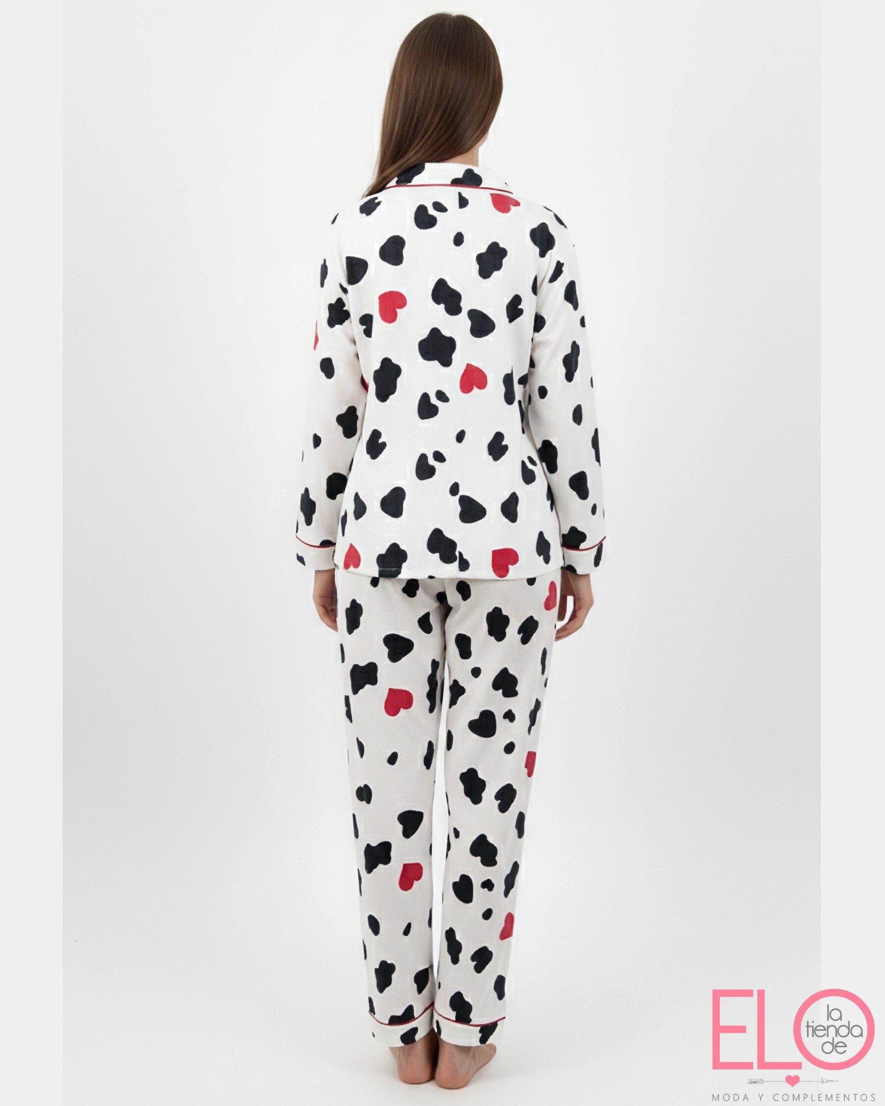 De color blanco con estampado de manchas y corazones de color negro y rojo.