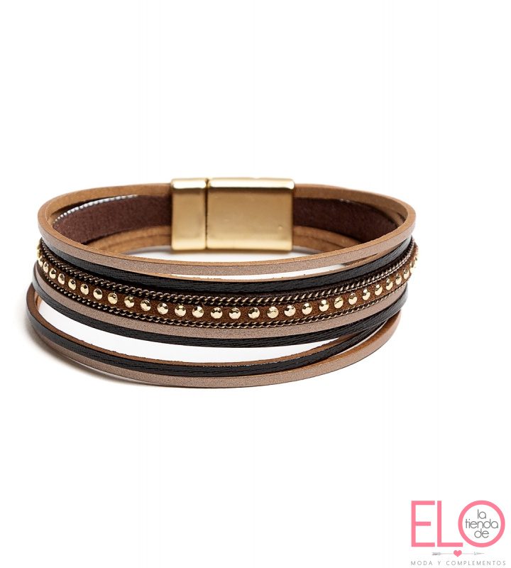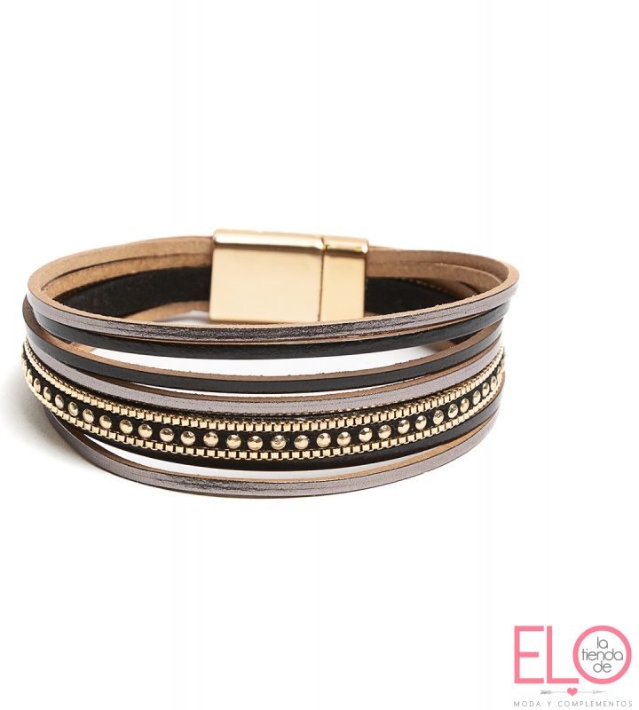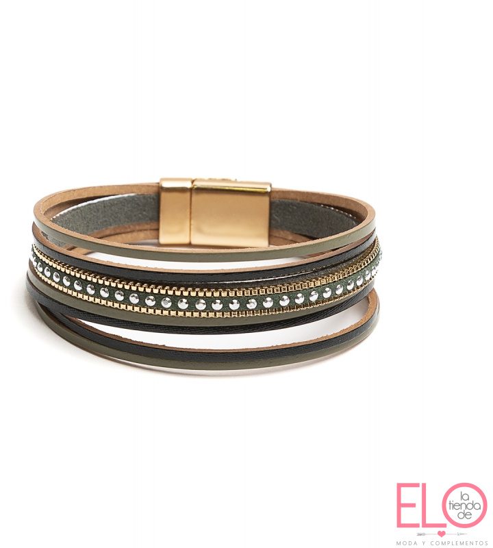 Pulsera de multilíneas en varias tiras de gama de colores con mini tachitas y cadenilla, cierre en imán, en cojín exhibidor, en tres colores: negro/plata,marrón, verde caqui.