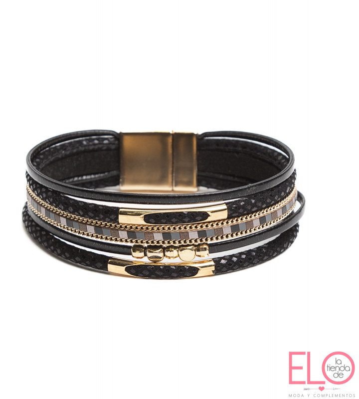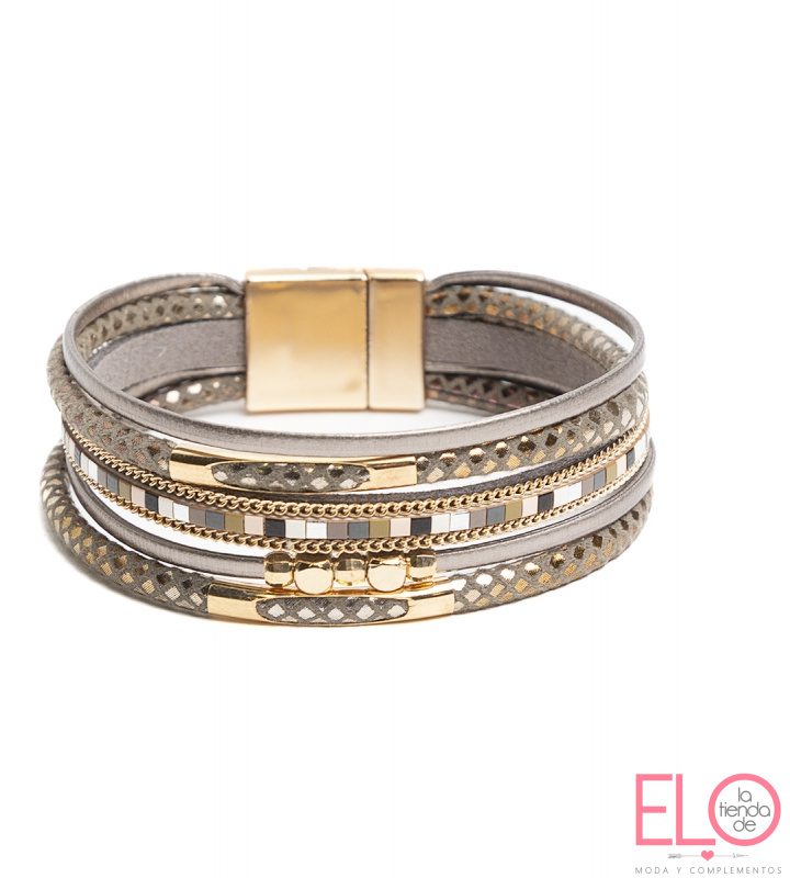 Pulsera multilíneas con cordón Angelina, piezas metálicas doradas, cierre en imán, en cojín exhibidor, en tres colores: gris/plateado, marrón, negro.