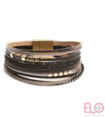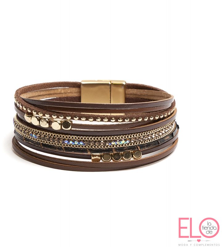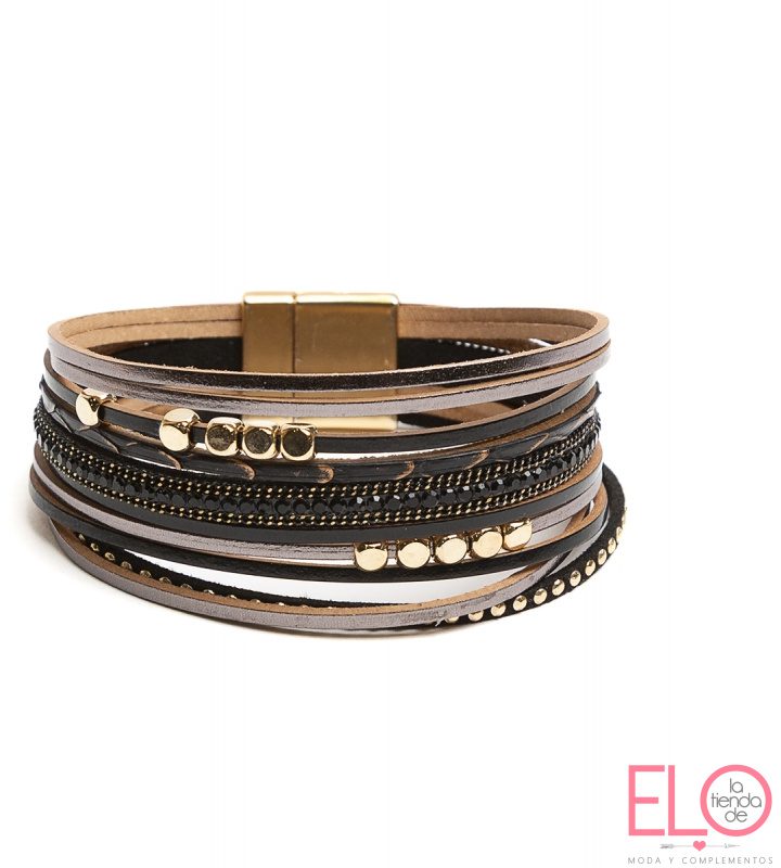 Pulsera de multilíneas con piezas metálicas, cadenilla y mini cristales, cierre en imán, en cojín exhibidor, en dos colores: negro/dorado, marrón/dorado.