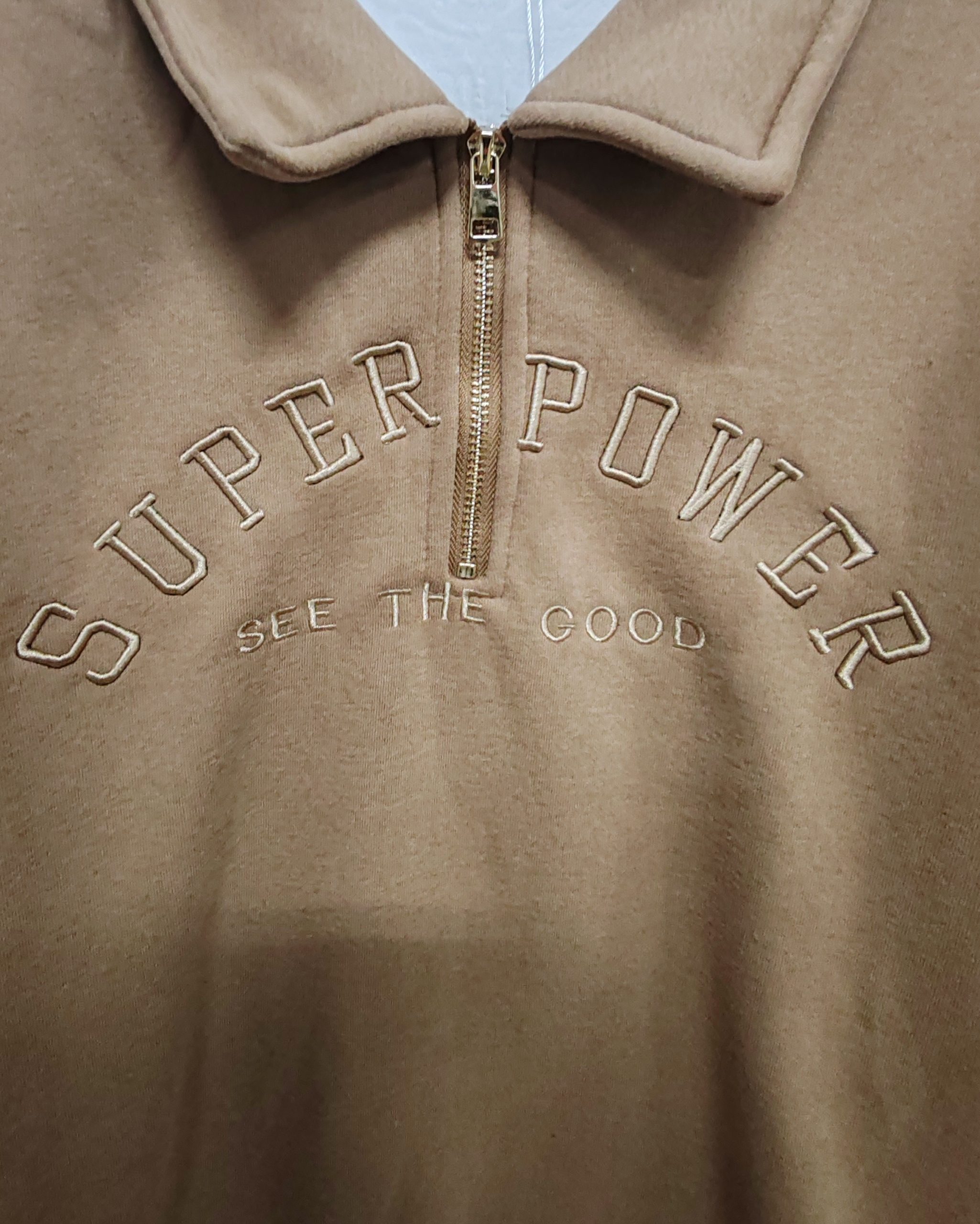 Lleva bordado en el pecho con la palabra «SÚPER POWER»