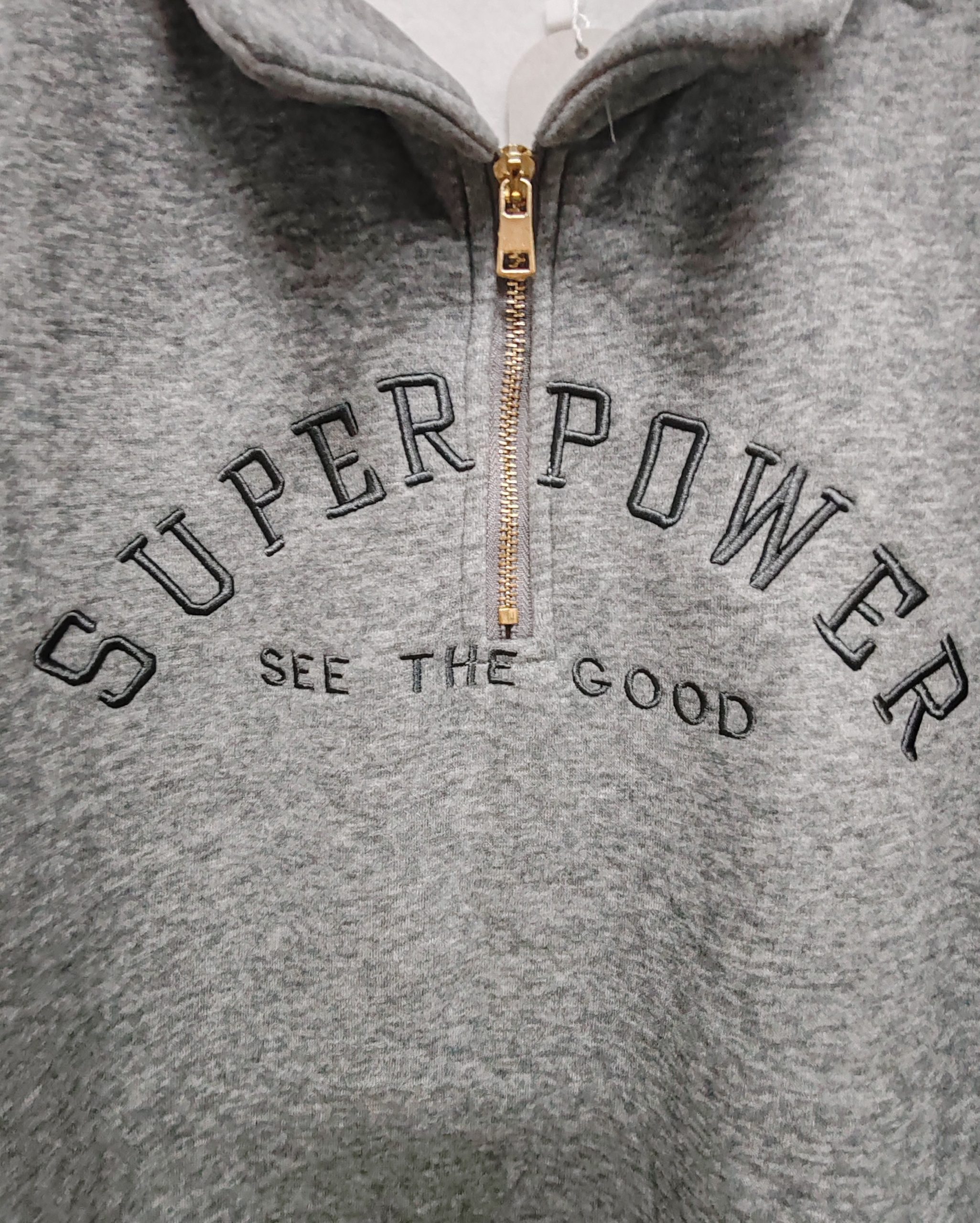 Lleva bordado en el pecho con la palabra «SÚPER POWER»