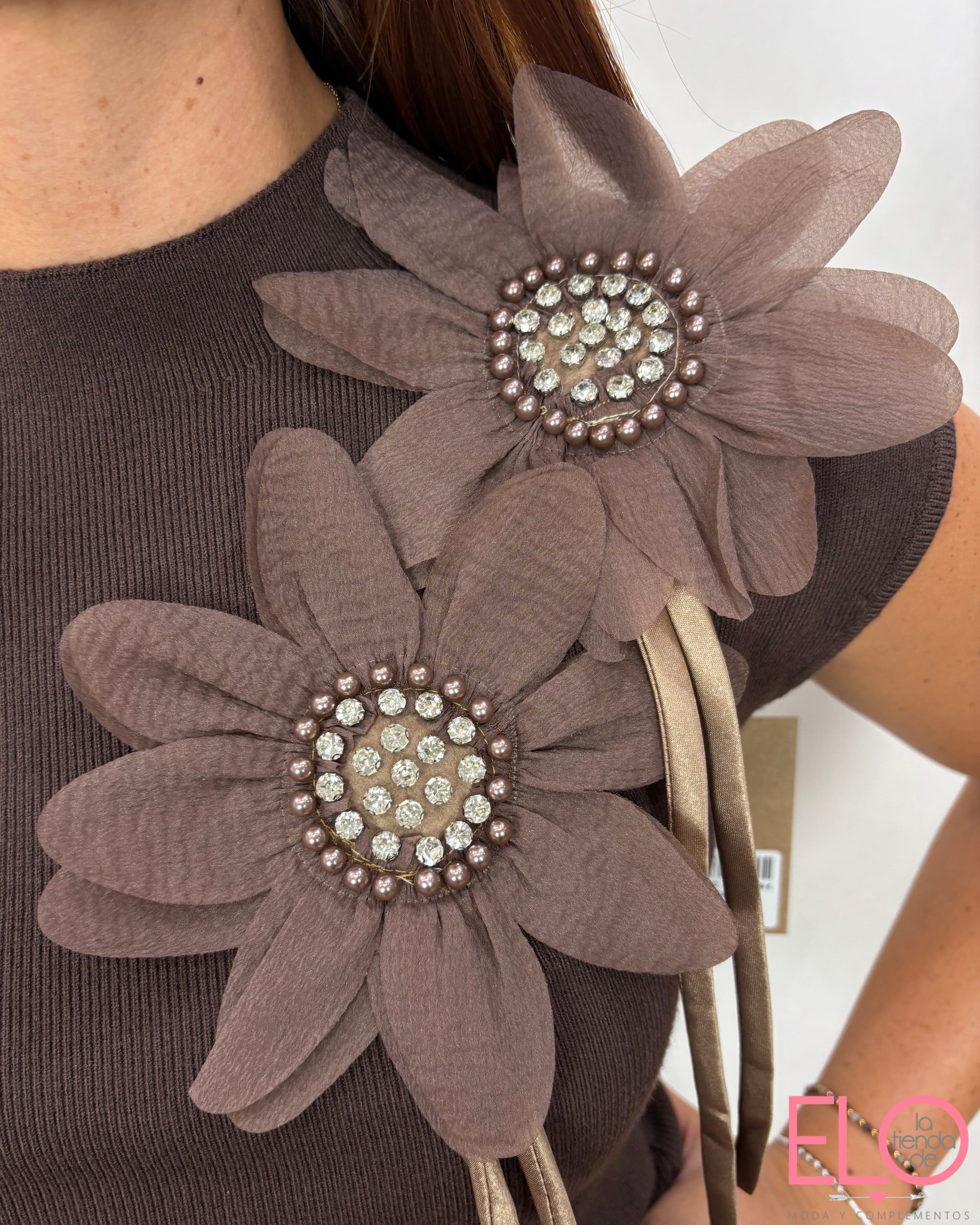 Lleva dos flores grandes al lado, decoradas con perlas y brillos.