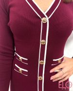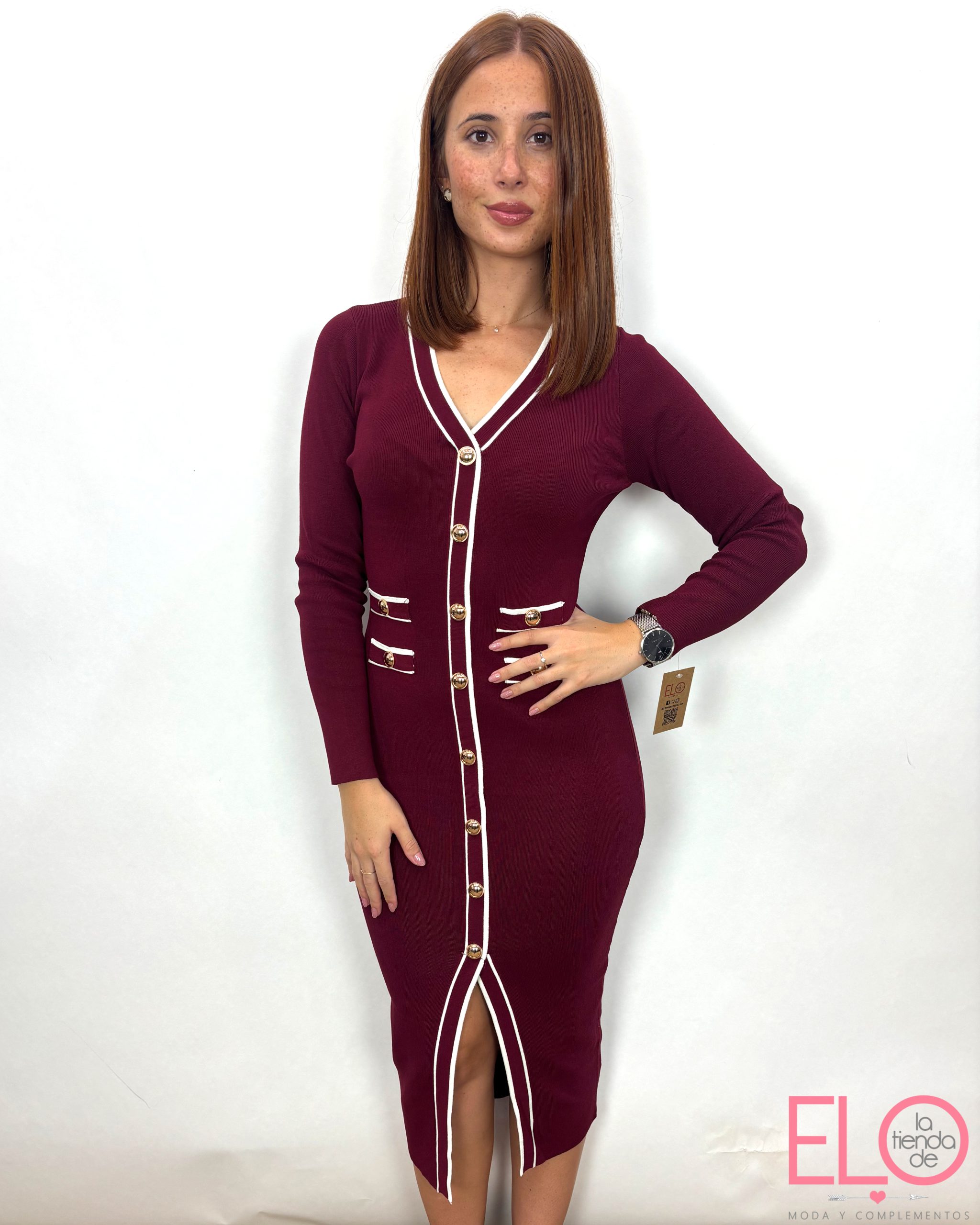 Vestido de hilo largo de color granate con bordes beige.