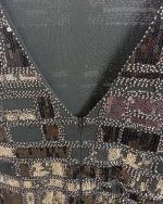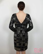 De manga larga y tul, decorado con lentejuelas negras y plata.