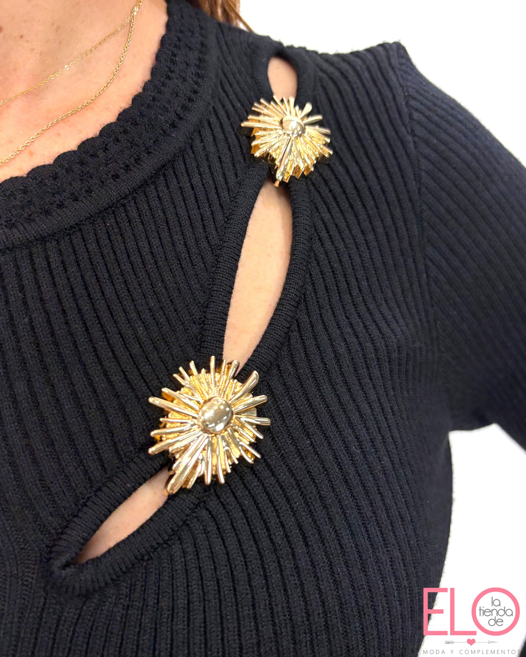 Tiene una abertura sobre el hombro izquierdo, decorado con de botones grandes en forma de flor de color dorado.