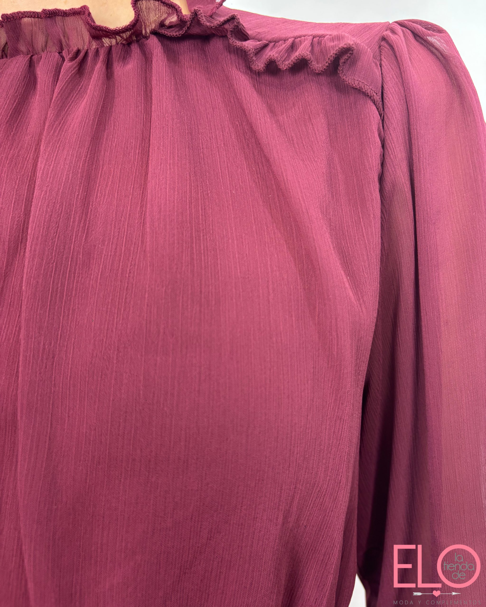 Lleva goma en la cintura y volantes pequeños en el cuello y hombros.